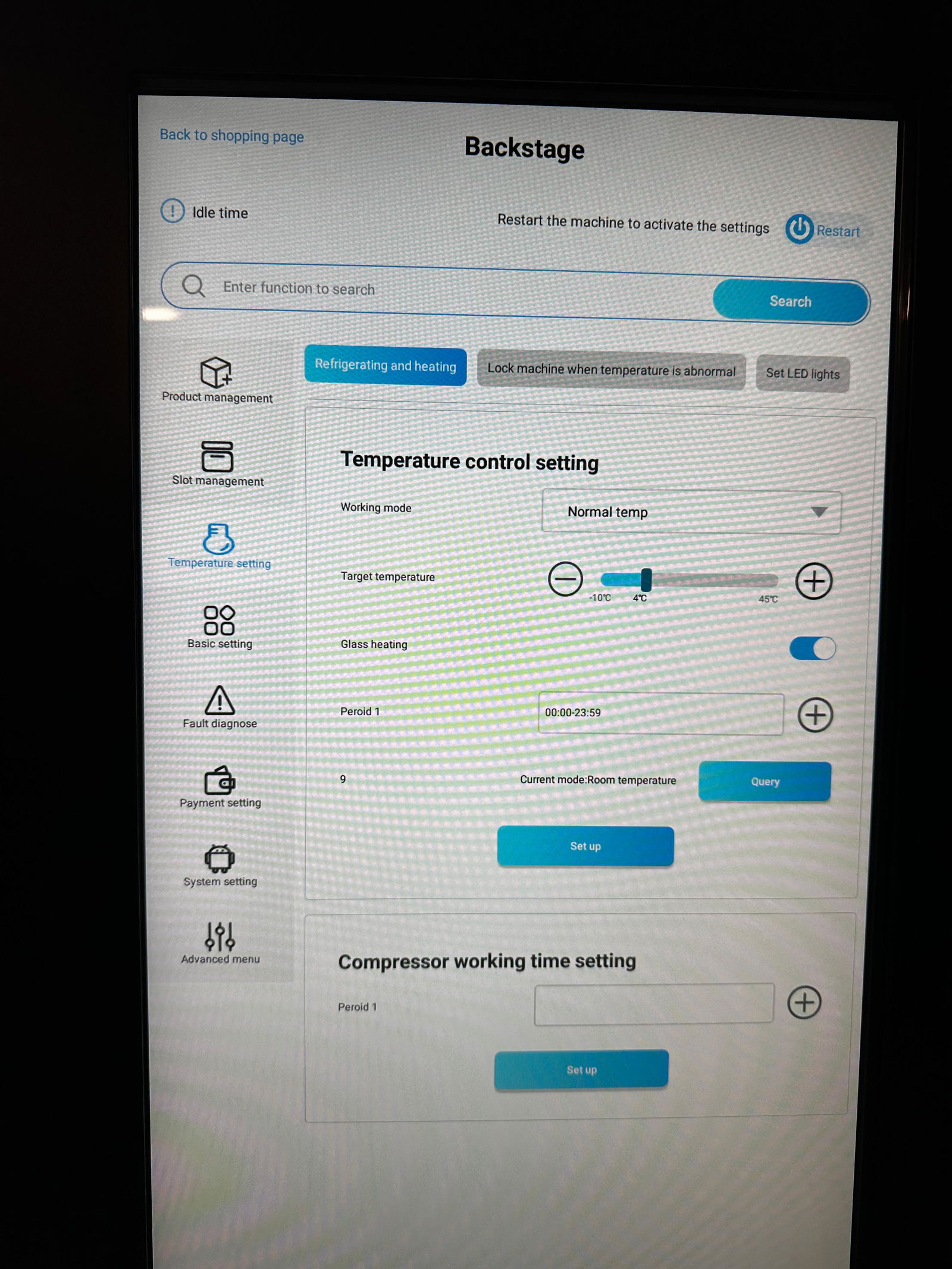Im Backend des 22" Screens könnt ihr unter "Temperature Setting" die Temperatur mit einem Regler steuern und mit Klick auf "Set up" bestätigen