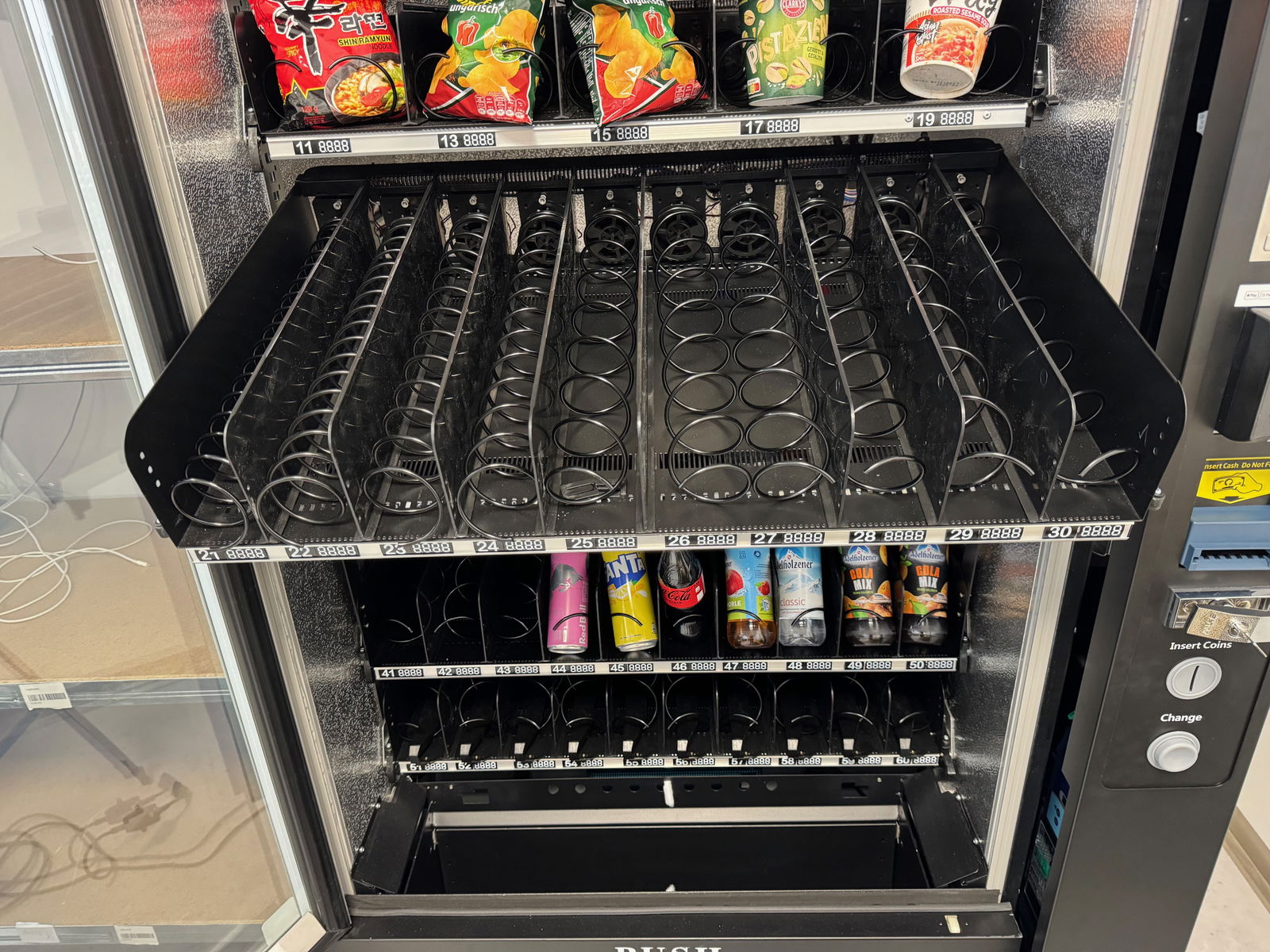 Je nach Abmessungen der Produkte in deinem Automaten kann es nötig werden, die Anordnung der Produktfächer anzupassen, um sicherzustellen, dass die Produkte richtig ausgegeben werden und nicht hängen bleiben oder beschädigt werden.
