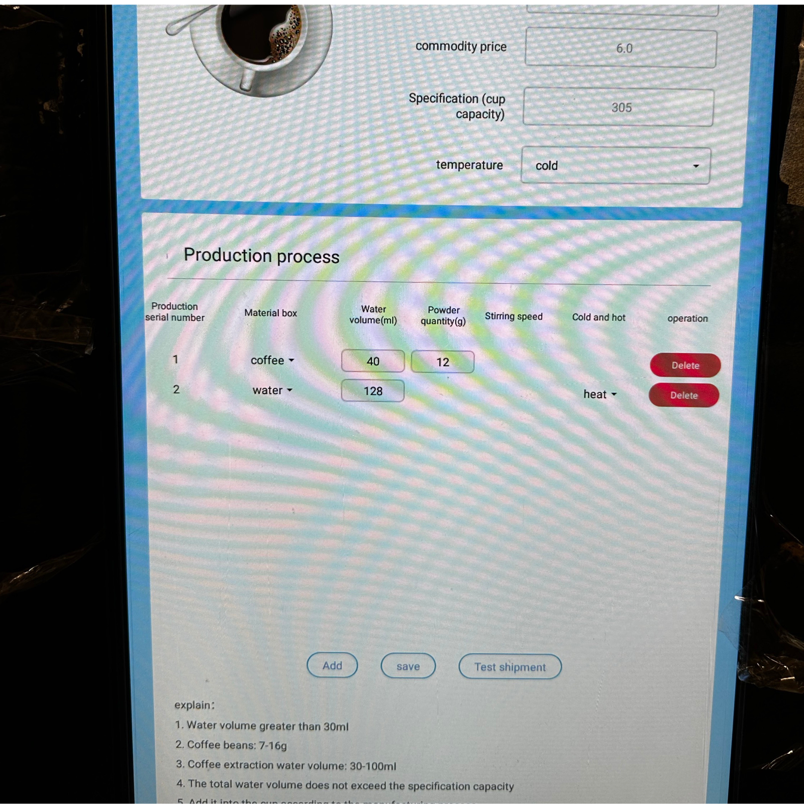 2. Wie man hier sieht beim Kaffee Americano, werden 50ml Wasser und 12g Pulver gemischt. Außerdem werden 128ml Wasser erhitzt und dazugegeben.